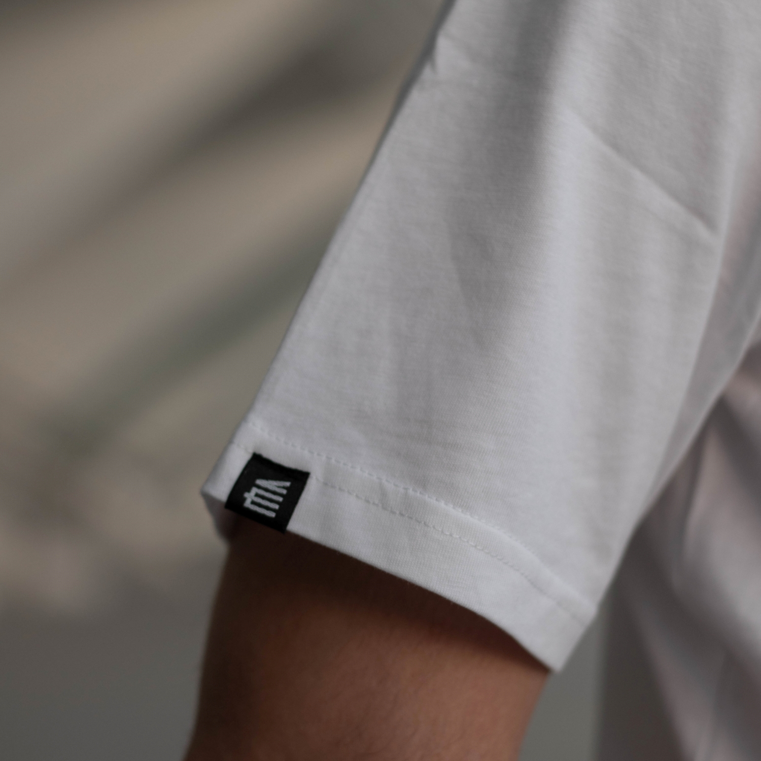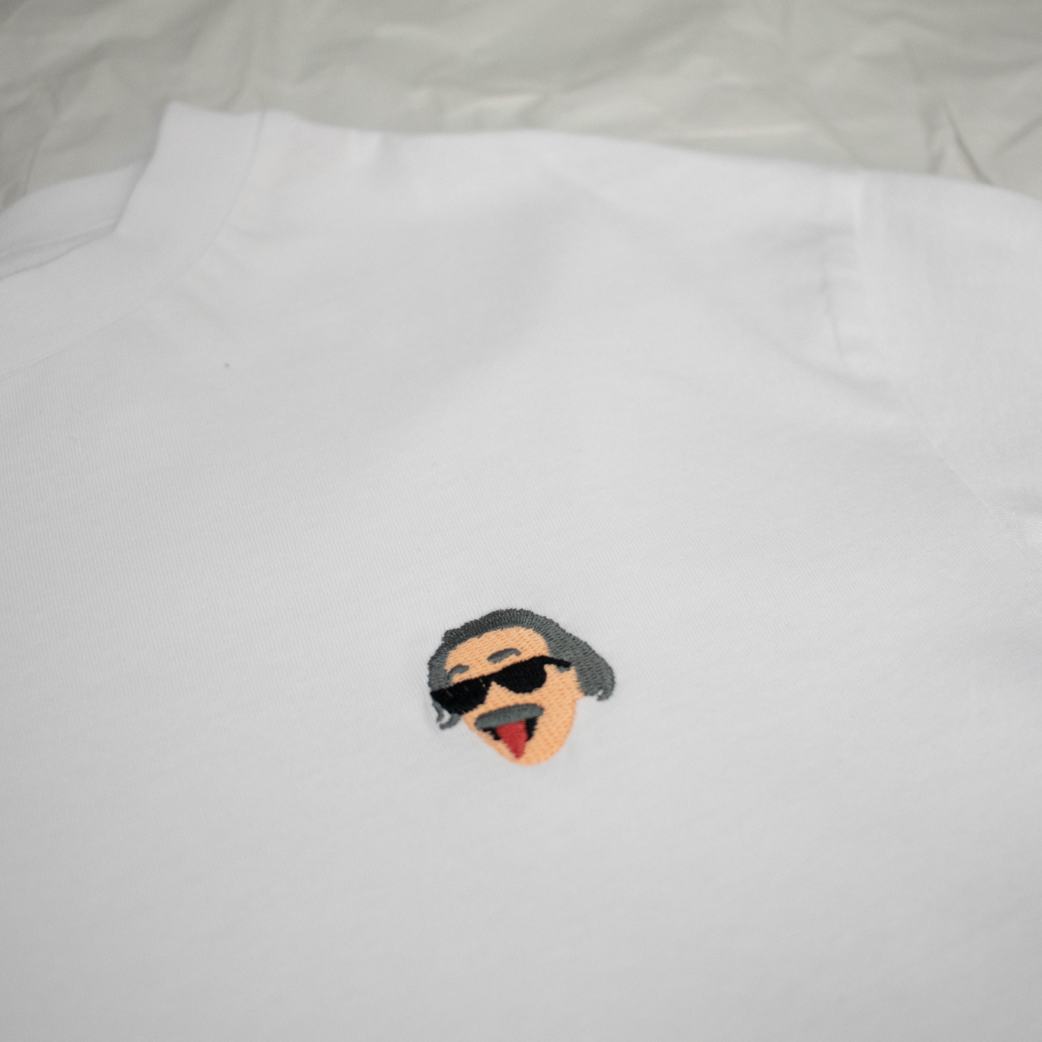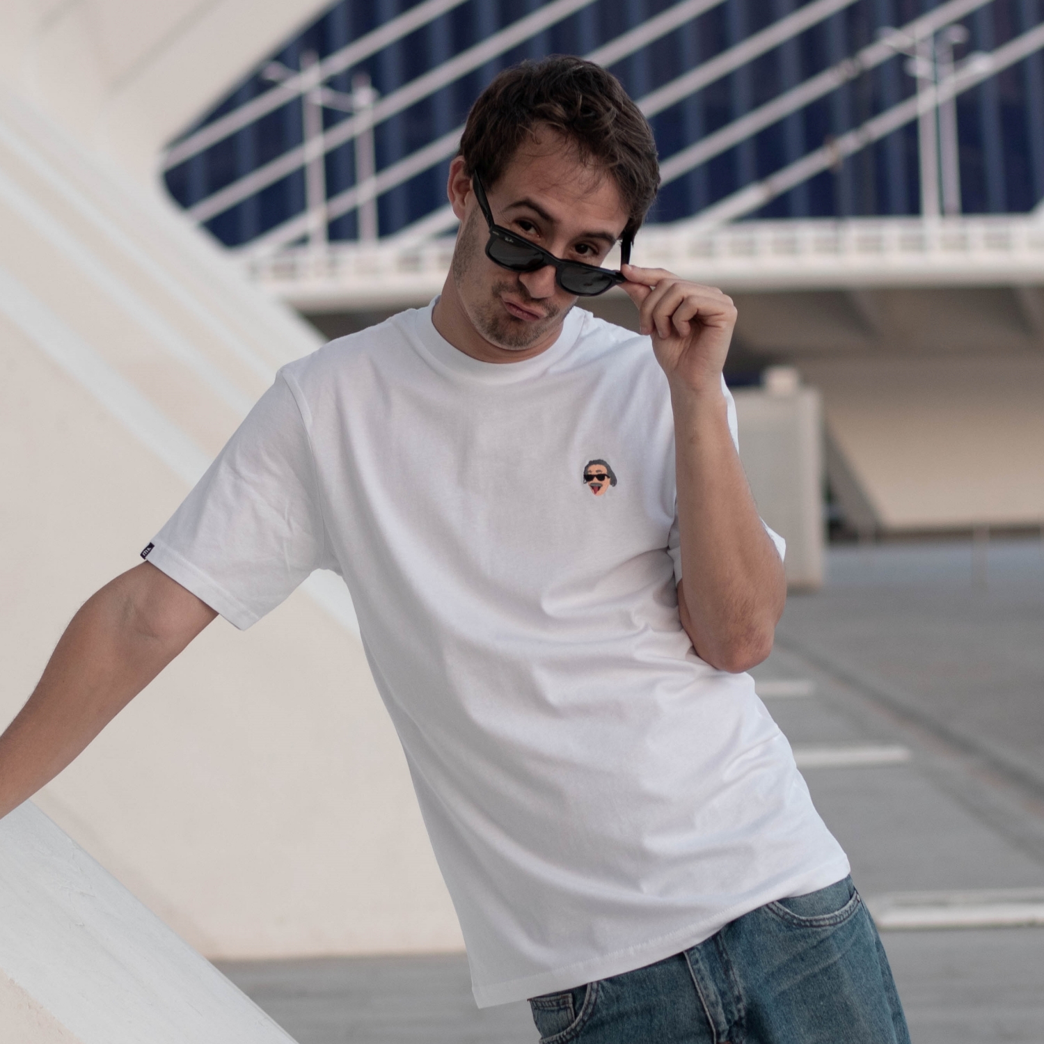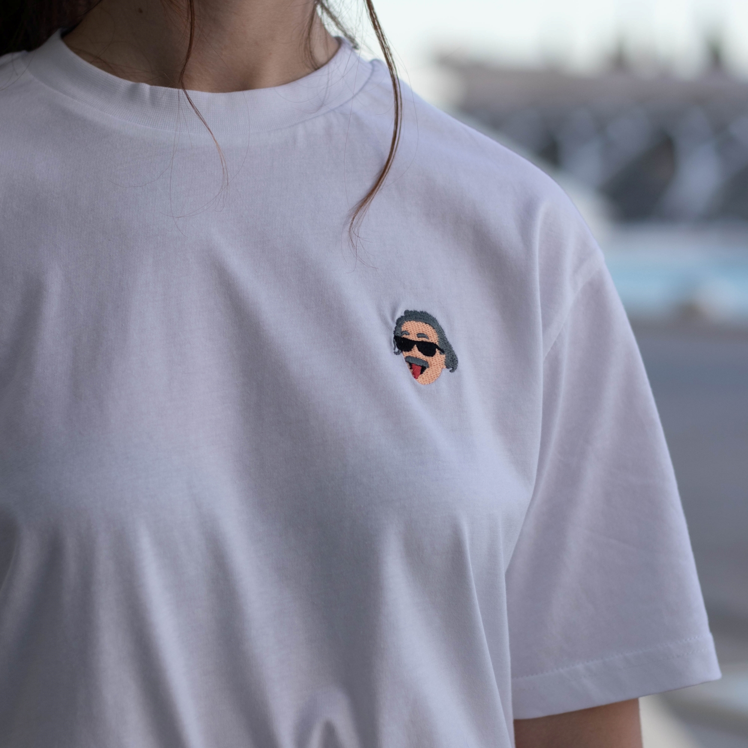 Camiseta blanca de corte “regular”. Diseño “Albert Einstein” bordado en filamento continuo de poliéster, trilobal. Punto liso 100% algodón orgánico, 185/190 gsm.